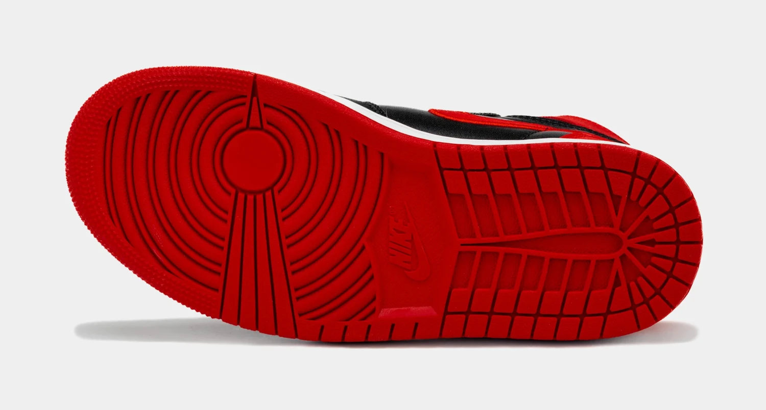 The Pre-Schoolers’ Satin Black and Red Air Jordan 1 Retro OG High-Top features an upper with a black satin base at the collar and side panel but a red satin base on the non-perforated toe box. Black satin overlays adorn the toe cap and midfoot while red satin overlays cover the heel and collar and form the side-panel Nike Swoosh. Black laces crisscross over a black tongue, and a black sock liner surrounds a red insole. This vibrant upper rests on a contrasting white foam midsole that contains air for lightweight cushioning and a durable red rubber outsole.