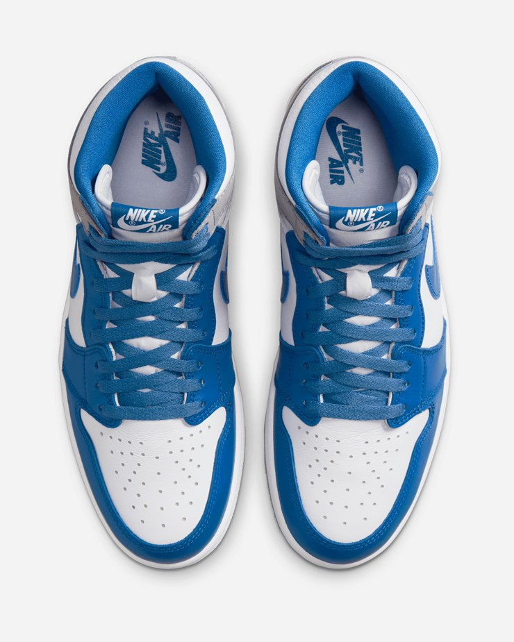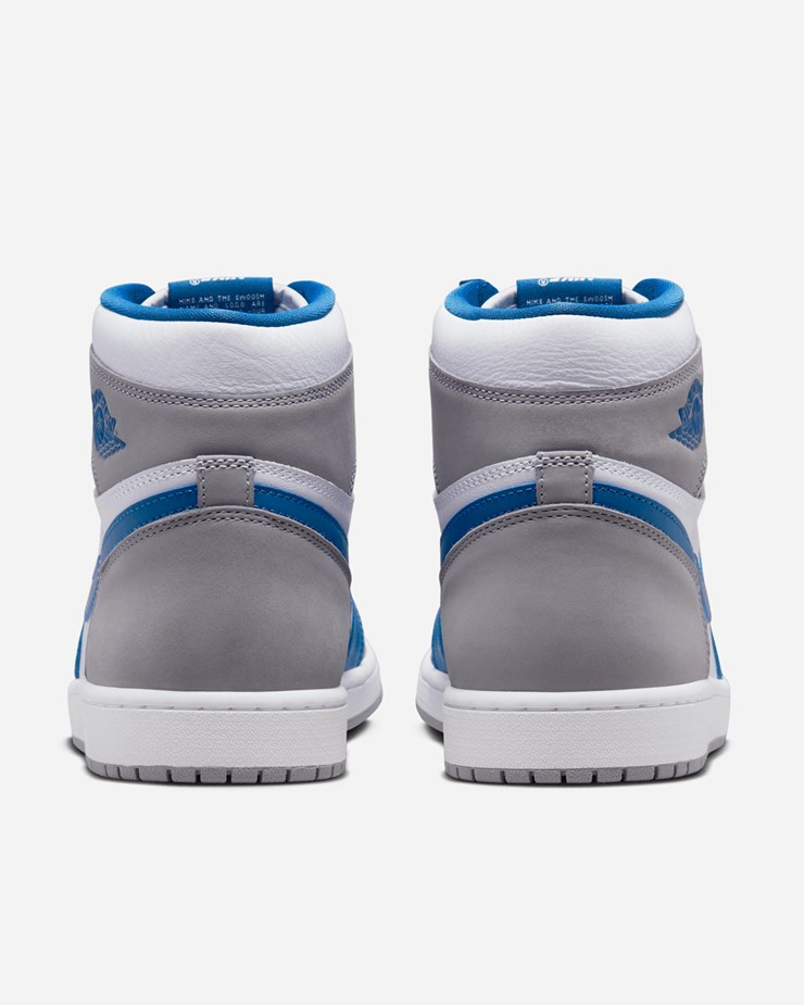 The upper section of this Retro High shoe is constructed of smooth leather. The base is white, the Swoosh is true blue, and the overlays are true blue and cement gray. True blue is also used for the Wings logo on the collar, tongue tag, laces, Nike Air branding on the white insole, and sock liner. Soles with encapsulated AIR units complete the design.