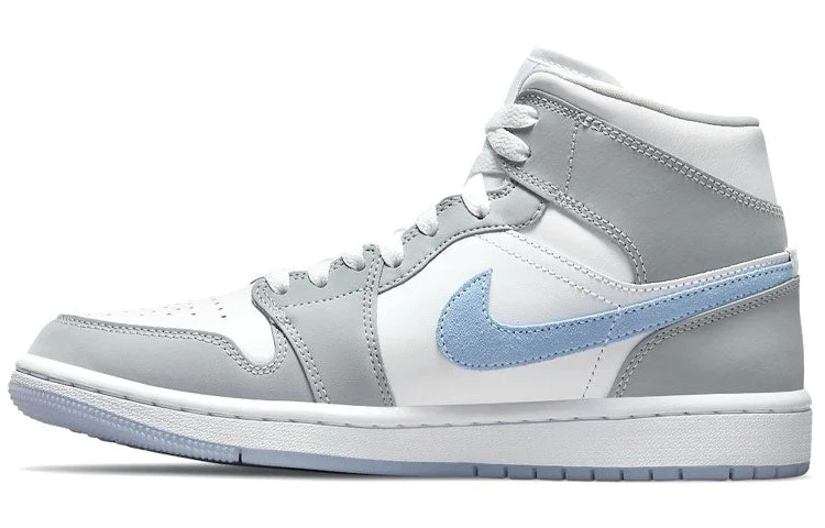 The Jordan 1 Mid Wolf Grey Aluminum features a white leather upper with Wolf Grey Drawback overlays and an Aluminum Swoosh. From there, a Jumpman woven tongue label and icy translucent sole completes the design. The Jordan 1 Mid Wolf Grey Aluminum released in July of 2021.