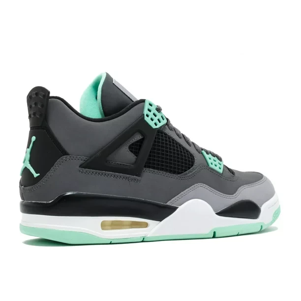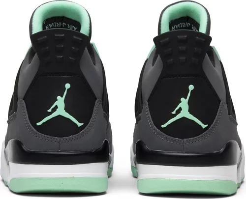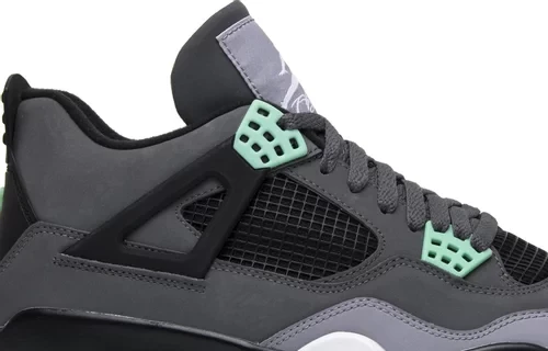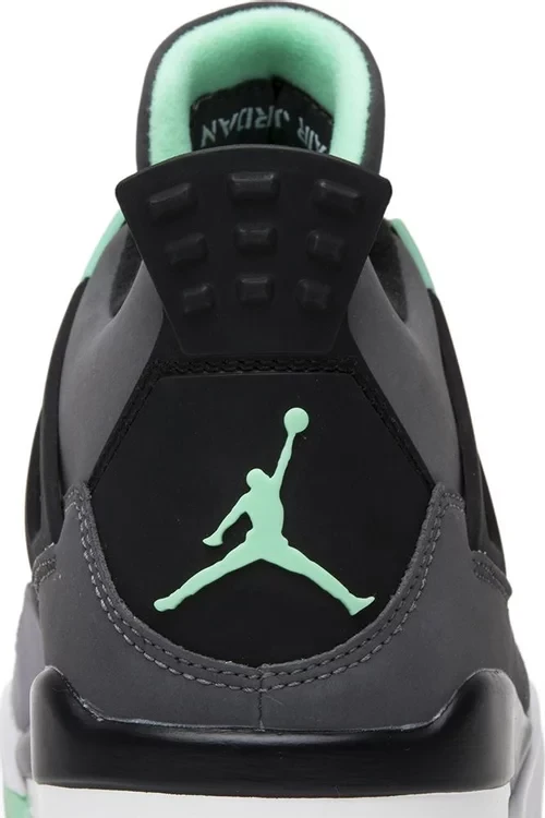 The Air Jordan 4 Retro Green Glow is covered in Green Glow, dark gray, black, and Cement Gray colorways. The sneaker is a product of synthetic material, which provides the texture. The outsole features a green glow, the midsole is entirely white, and the black, dark gray and Cement Gray covers the upper part of the shoe. It features two Jumpman, one at the tongue and the other at the heel.