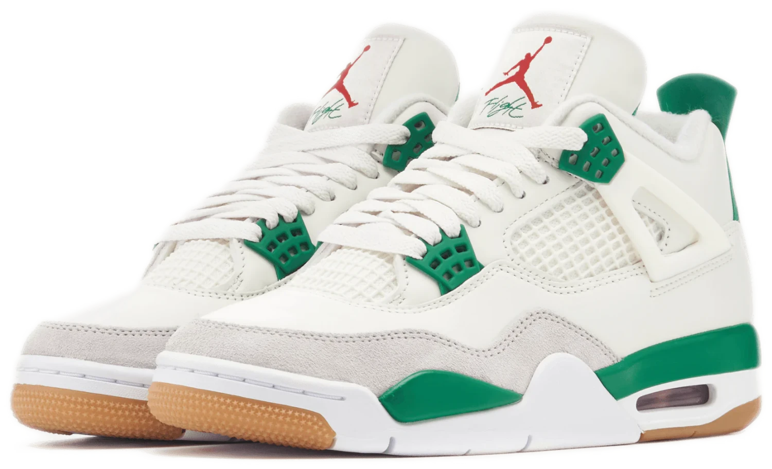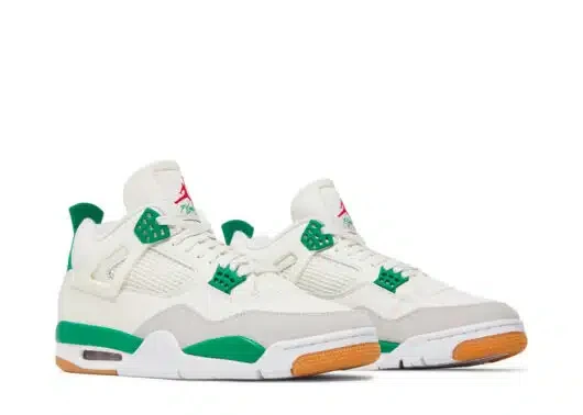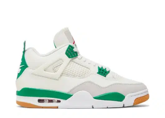 The Jordan 4 Retro SB Pine Green used a white leather upper with a Neutral Grey suede mudguard. The limited edition sneakers sit on top of a white and Pine Green midsole which is highlighted by a red air unit. Nike used a gum outsole to help with increased grip while skateboarding.
