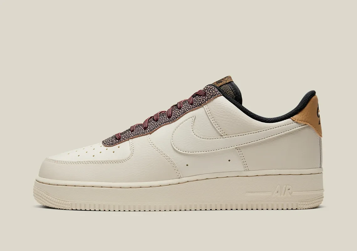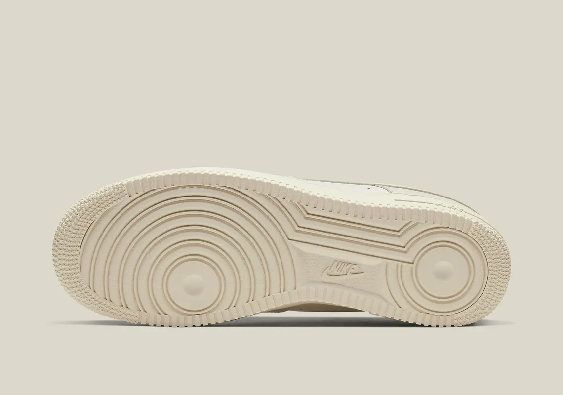 The Nike Air Force 1 Low Fossil features a white leather upper with a woven tongue, pebbled leather eyestay, and ivory Swooshes. From there, a tan "Air" logo on the crown of the heel and ribbings along the edge of the outsole complete the design.
