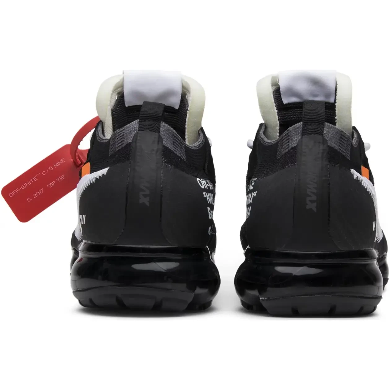 This sneaker features a black colourway with a clean, transparent VaporMax Air-Sole unit, matching black laces written ‘Shoe Laces’ in white, and a white Swoosh logo accented by a red zip tie. It has an exposed-foam tongue with a black Nike logo and orange Swoosh. To complete the look, the medial side of the shoe displays Abloh's signature ‘Off-White’ for Nike lettering.