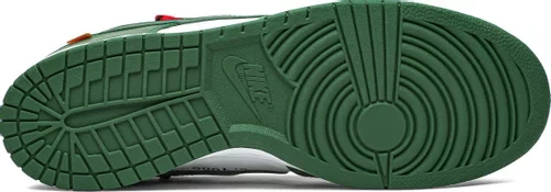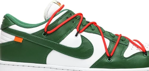 This Dunk Low is comprised of a white leather upper with pine green overlays. A unique secondary lacing system, zip-ties, and signature Off-White text on the sides completes the design. These sneakers released in December of 2019.