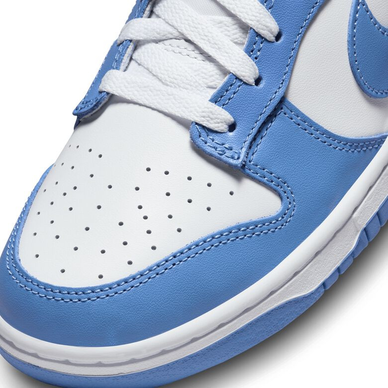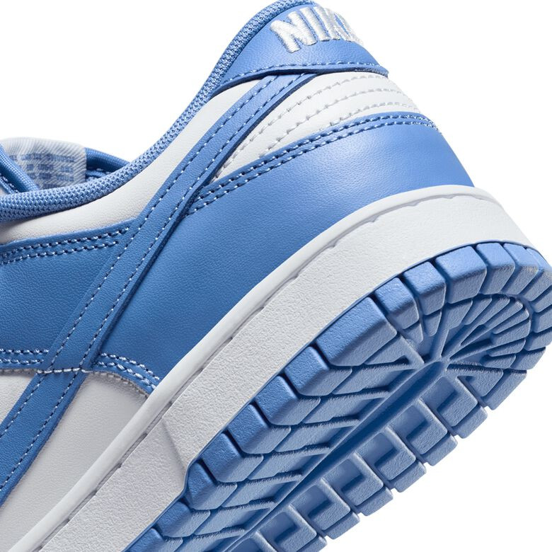 This iteration of the Nike Dunk Low is constructed with leather uppers and a rubber outsole. The base is white rubber, and Polar Blue overlays line the perforated toebox, the heel, the laces, and the midsole. The Nike Swoosh also appears in Polar Blue on the midsole. The tongue is padded for comfort, and white Nike branding is also visible on the heel.