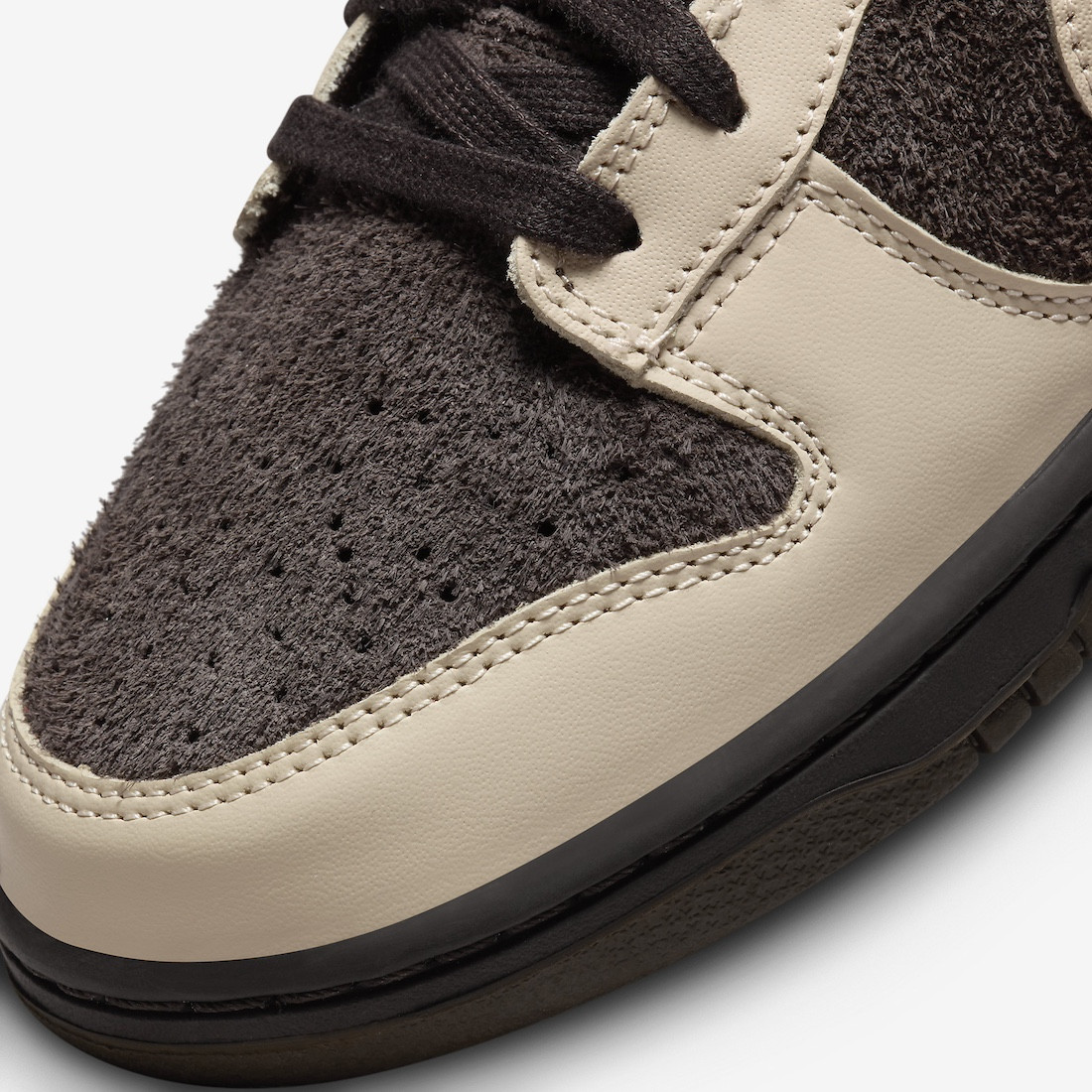 The dark, shaggy suede upper is contrasted by the Rugged Orange of the suede heel overlays, heel tab, and the ‘NIKE’ branding on the texturized tongue. Additional color blocking includes smooth leather details in Sanddrift, including the Swoosh, the toe box, and the lace cage. On the bottom, the sneaker features a dark midsole and a matching rubber outsole.