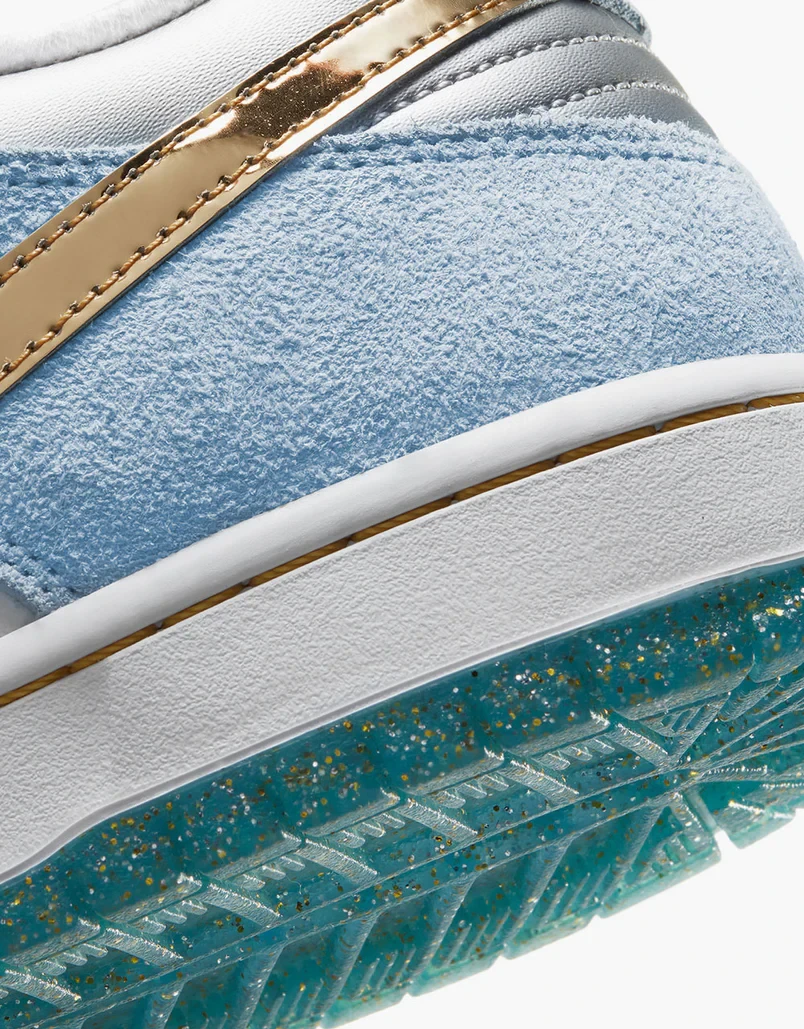The Nike SB Dunk Low Sean Cliver is filled with holiday cheer. The upper holds a mix of sky blue suede and white tumbled leather, adding luxe looks to the skateboarding sneaker. Next, a metallic gold Swoosh shines on the upper as well, matching a gold speckled, blue outsole and gold embroidered Nike logo on the heel. The sneaker's toe displays air holes patterned after snowflakes, while the insoles continue the festive design by showcasing Christmas elves painting holiday toys.