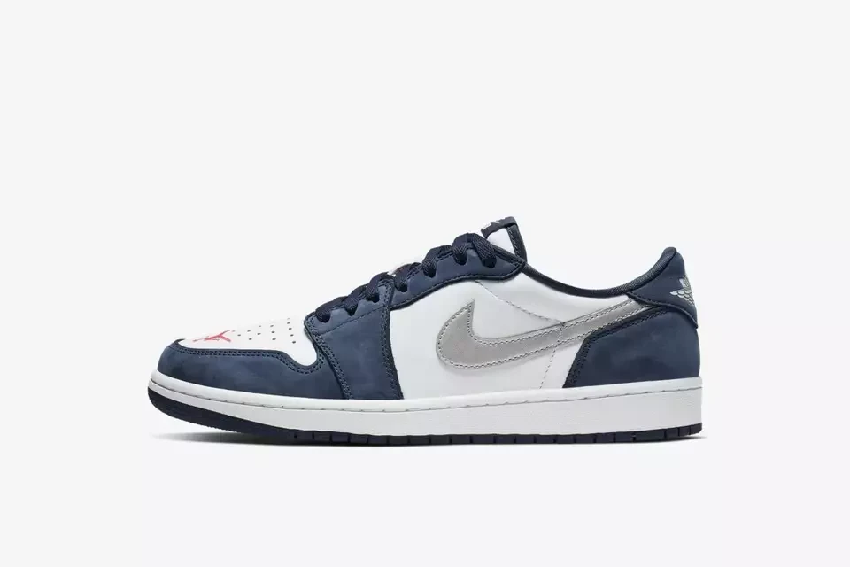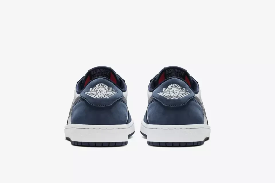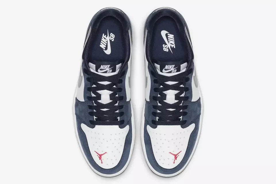 et some double kickflips in while rocking the Jordan 1 Low SB Midnight Navy. This AJ 1 low SB comes with a white upper plus blue accents, grey Nike "Swoosh", red Jordan jumpman, white midsole, and a blue sole. These sneakers released in June 2019.