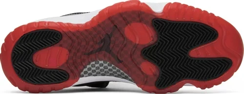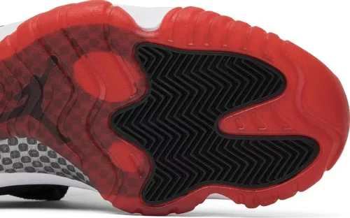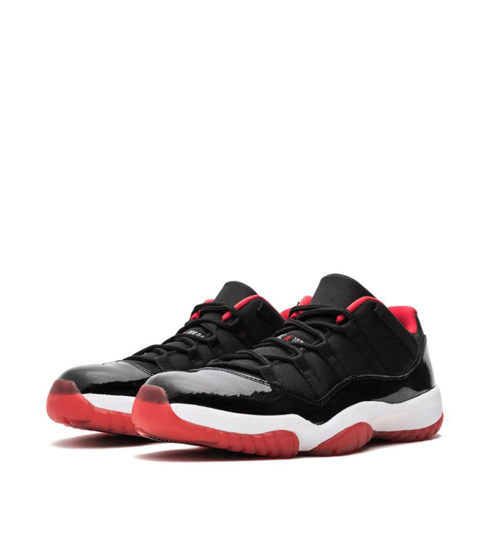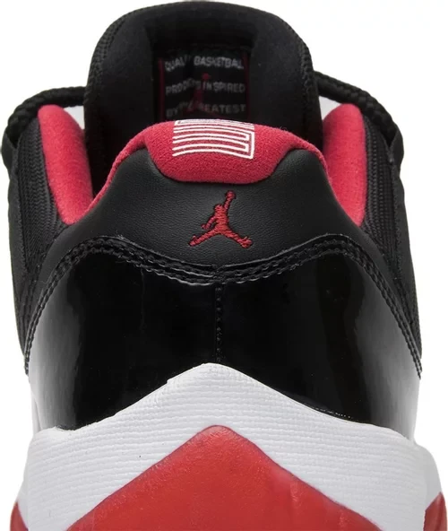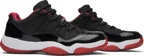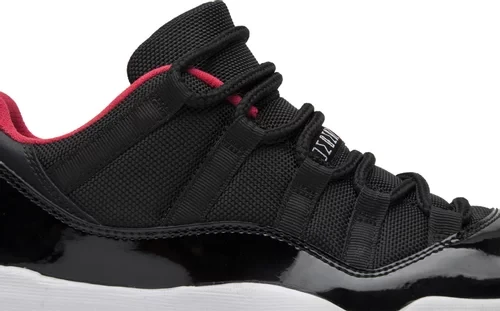 The Air Jordan 11 Retro Low Bred, adorned in Red and White with a Red semi-translucent accent on the mudguard, comes in a full Black net and leather materials.