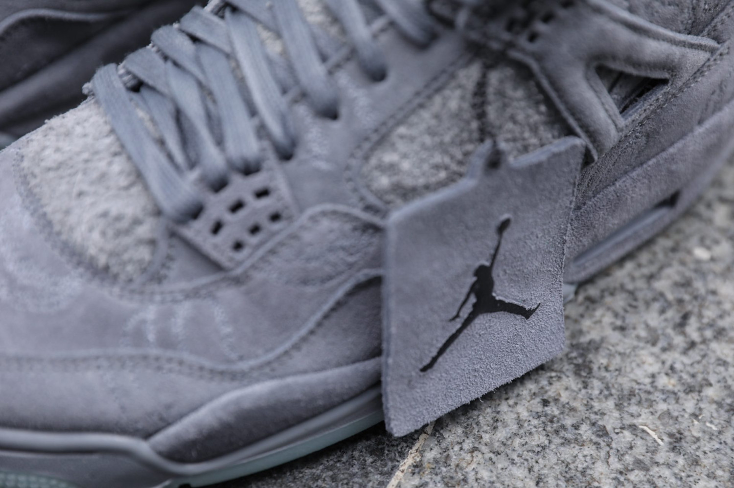 The suede upper of this Air Jordan 4 model has a mix of heathered and smooth textures throughout, and it is bathed in a tonal gray shade. The upper of this shoe also boasts carved KAWS hand designs and a matching hang tag. Suede material is also used to wrap the upper "Wings" and the midsole. Air units are included in the soles.