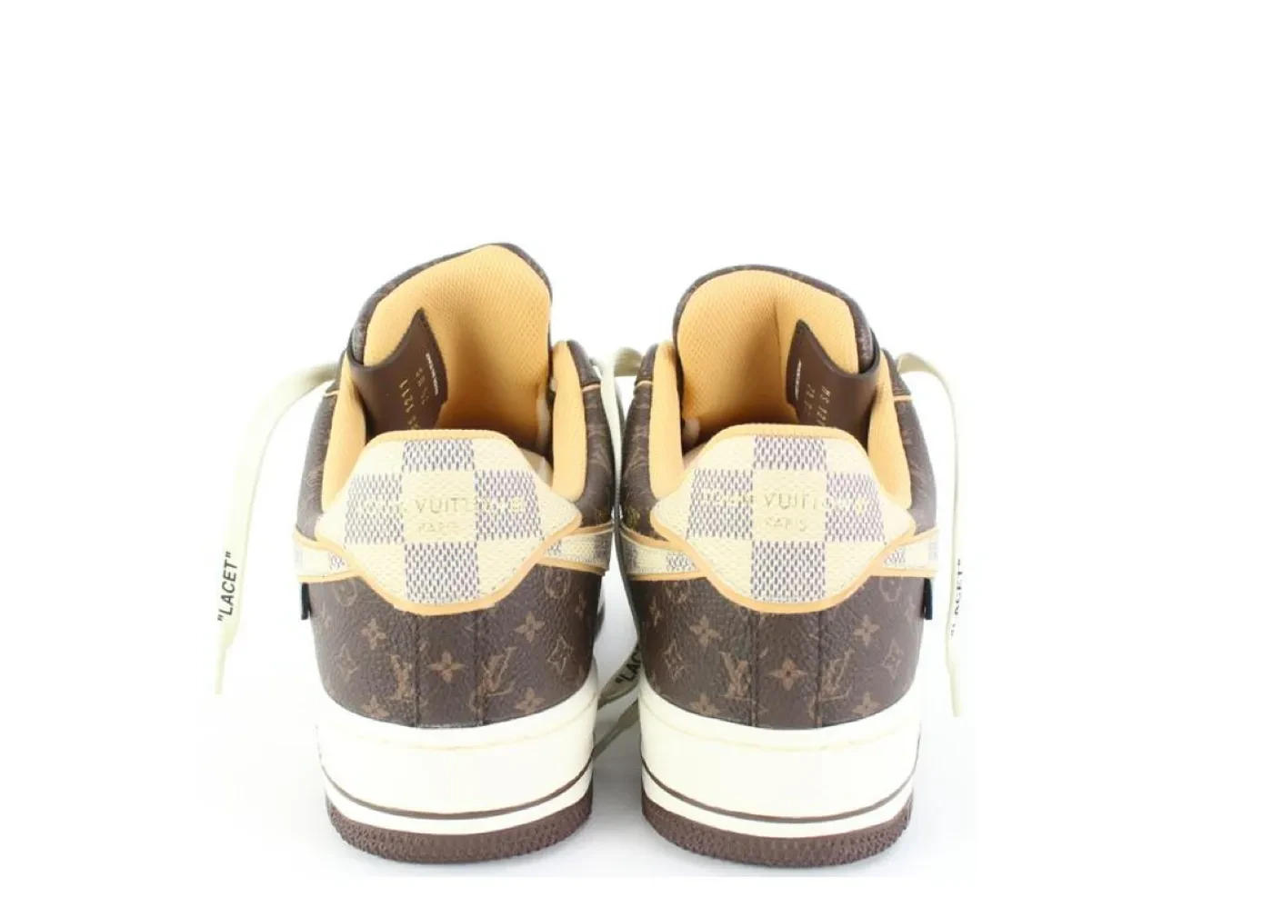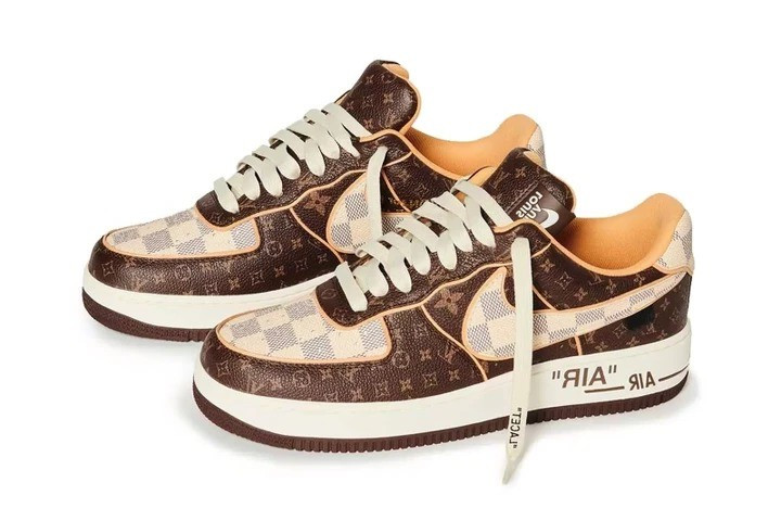 The Nike Air Force 1 Low Louis Vuitton Monogram Brown Damier Azur are entirely made of leather, embellished with the emblematic Louis Vuitton Monogram and Damier motifs with natural cowhide profiles. Each pair is sold with a Louis Vuitton pilot case, also from the Louis Vuitton Spring-Summer 2022 collection, which has been reinterpreted from the Maison's archive in an iconic orange color and made of Monogram Taurillon leather. The case features Louis Vuitton's classic S-lock closure with white metal trim and includes a Nike Swoosh-shaped luggage tag. The case adapts to every shoe size, based on an internal cushioning system - created and also exclusively for this sneaker.