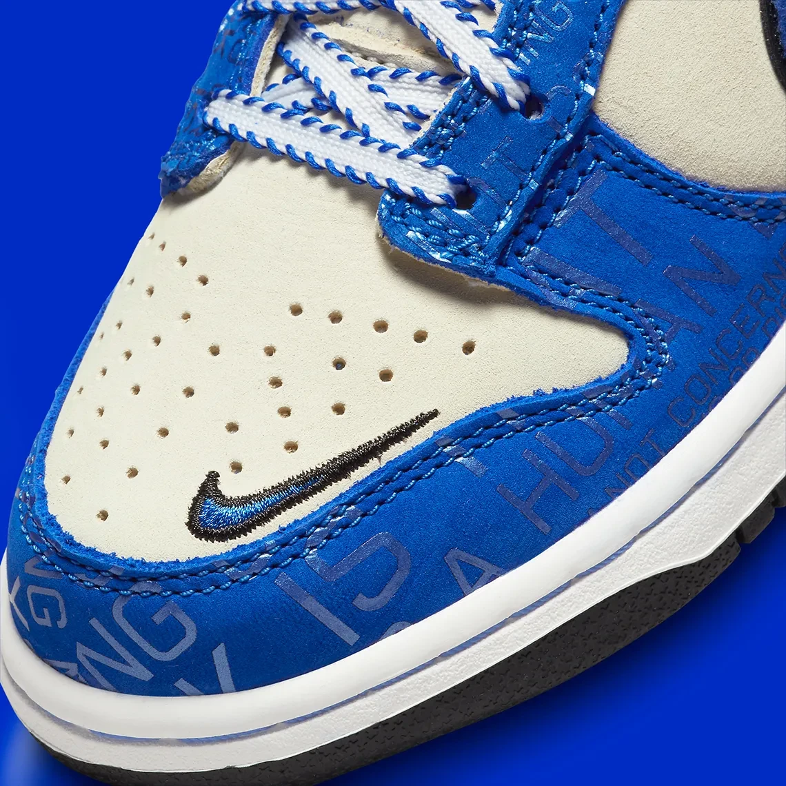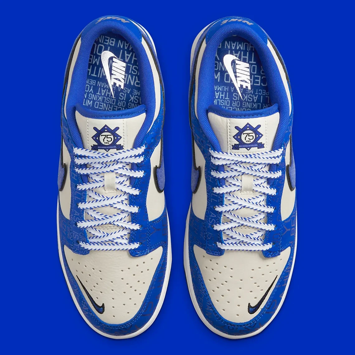The Nike Dunk Low Jackie Robinson boasts a Brooklyn Dodgers color palette with a light grey Durabuck upper, royal blue leather overlays, an embroidered mini-Swoosh at the toe, and a felted side Swoosh - reminiscent of baseball caps in the late-1940s. Throughout the design, Robinson's famous quote, "I'm not concerned with you liking or disliking me…All I ask is that you respect me as a human being", is printed in a pattern format. At the heel, Robinson's number 42 is embroidered, providing a custom feel.
