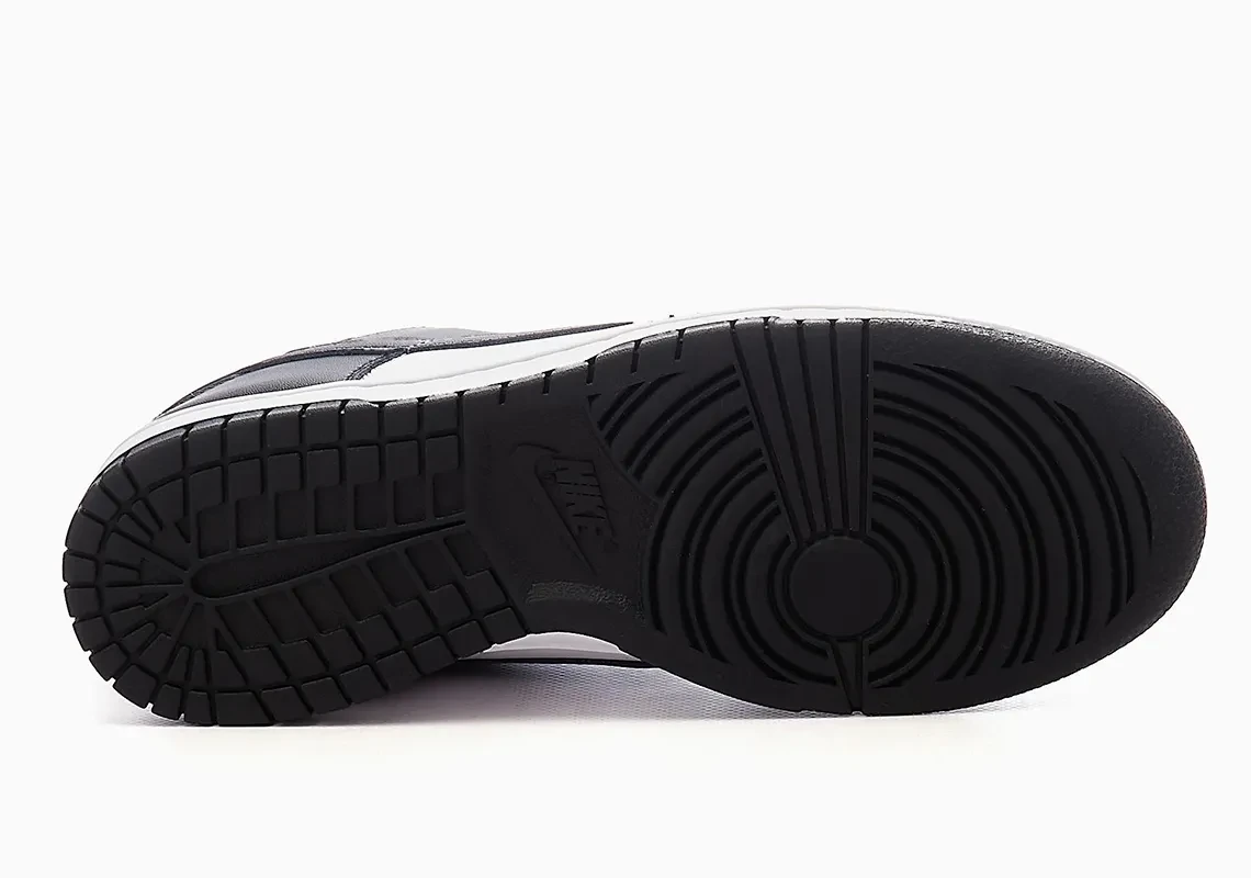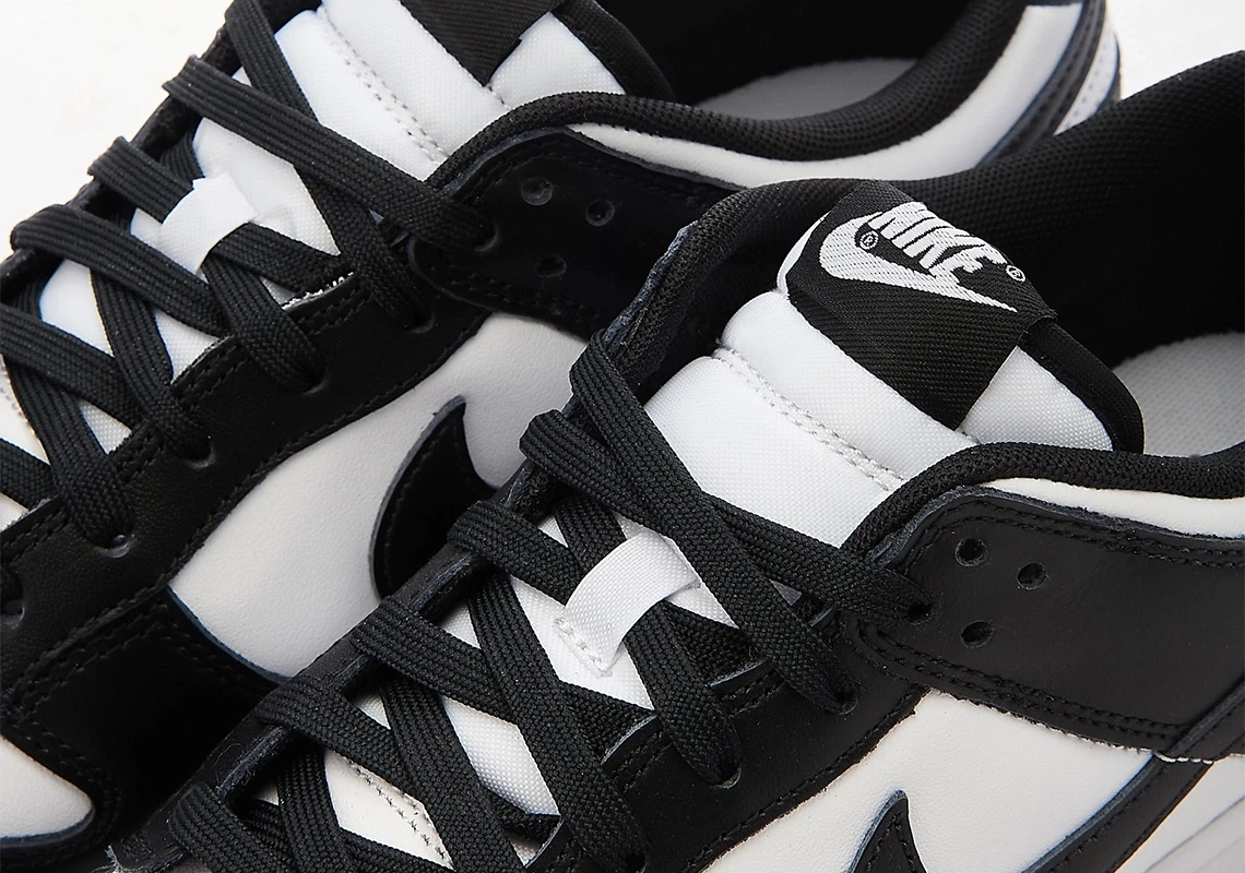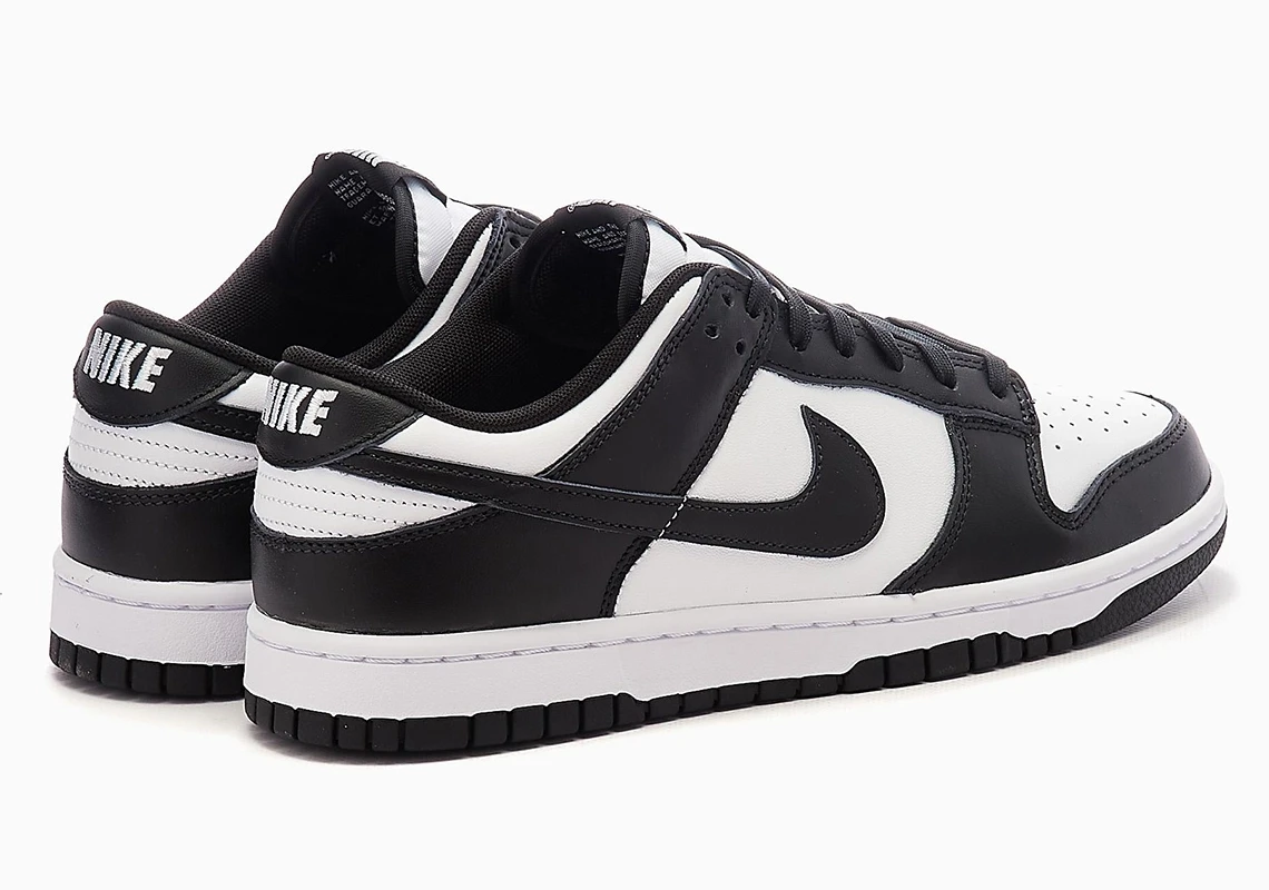 The upper Nike Dunk Low Retro White Black is constructed of white leather with black leather overlays and Swooshes. Classic Nike branding is featured on the nylon tongue, nodding to traditional Dunk design elements. A white midsole and black outsole complete the design.